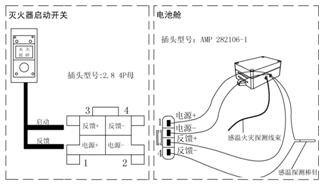 當任一保護區(qū)發(fā)生火險時,通過設定好溫度閾值的火災探測針進行溫度探測,當溫度升至設定值(普遍設定為130℃)時,輸出火險報警信號,駕駛員操作盤上的模塊發(fā)出聲光報警信號,當駕駛員人為判斷發(fā)生火險時,可通過模塊按鈕手動啟動滅火裝置進行滅火。在無人值守或無法手動啟動滅火裝置時,當溫度持續(xù)升溫至±175℃時,火災感溫探測線束會自動(無源)啟動滅火裝置,實現(xiàn)保護區(qū)滅火。
