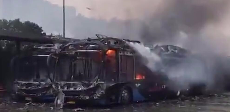 以上視頻為珠海公交場站“自燃”的電動大巴現(xiàn)場狀態(tài)。